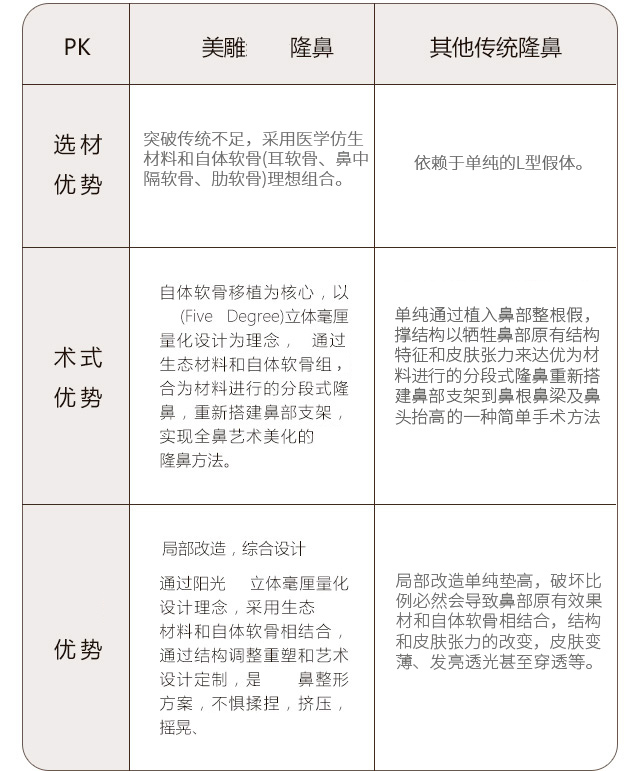 美雕隆鼻是在不破坏不改变鼻部原有的支撑结构下,以自体软骨移植为核心,以(Five Degree)立体毫厘量化设计为理念,通过生态材料和自体软骨组合为材料进行的分段式隆鼻,来重新搭建鼻部支架,实现全鼻艺美化的隆鼻方法。