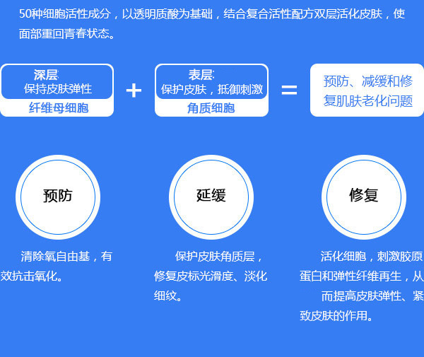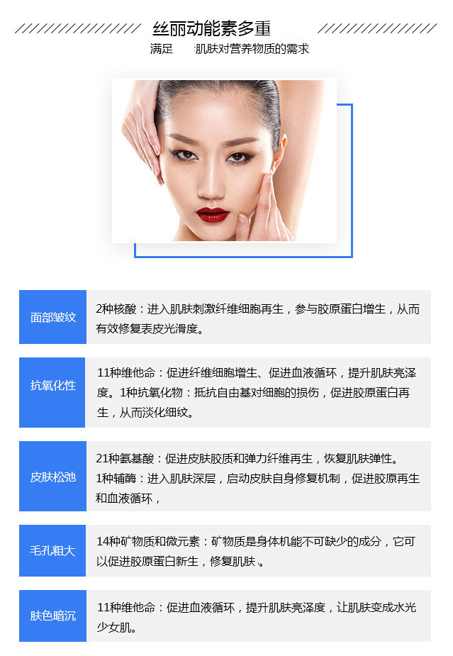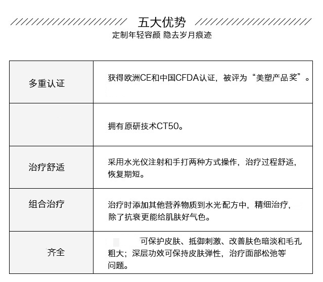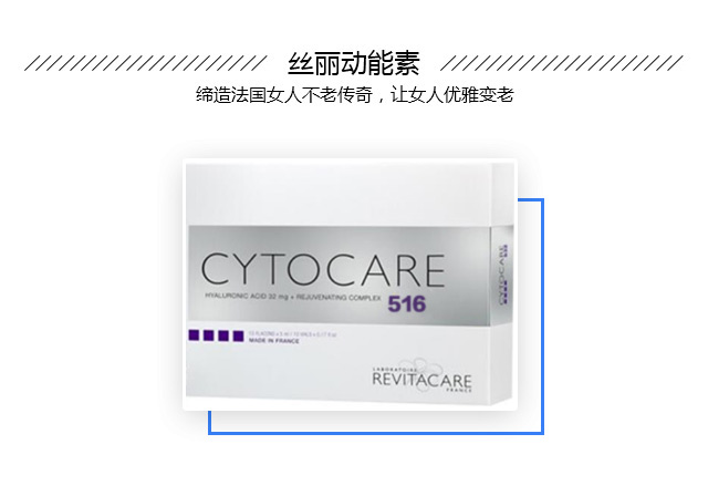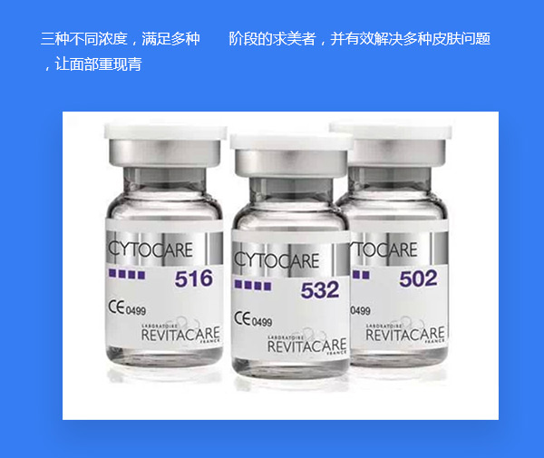 ,由法国Revetocare公司研发生产,获得欧洲CE和中国CFDA认证,是欧洲淡皱产品。拥有原研技术CT50,主要成份含有3种非交联玻尿酸、11种维他命、21种氨基酸、14种矿物质和微量元素、1种辅酶、2种核酸、1种抗氧化物等活性细胞成分,可抗击氧化,面部皱纹、皮肤松弛、肤色暗淡、毛孔粗大等衰老问题。