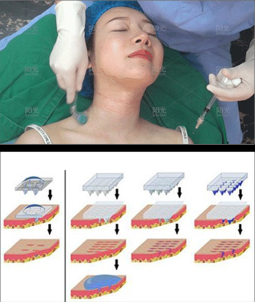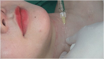 以透明质酸为母液(搭载多种氨基酸、L-肌肽和维生素等)注射至真皮层满足颈部肌肤的营养补给、填充组织容量缺失