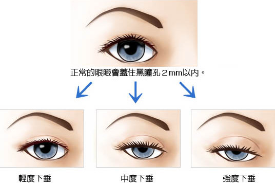 上睑下垂遮住眼角膜上2毫米为轻度上睑下垂,遮住眼角膜上2-4毫米之前为中度上睑下垂,4毫米为重度上睑下垂。