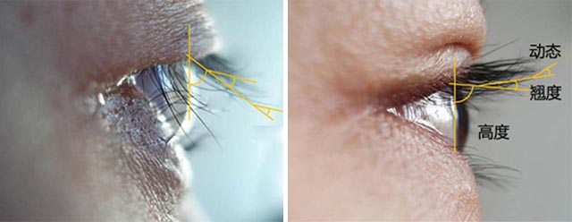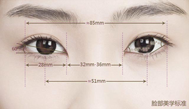 首先内眼角约48°,外眼角约60°,才可让黑瞳比例提升,数据化的脸部美学才有0误差的精细1mm眼部修复技术。